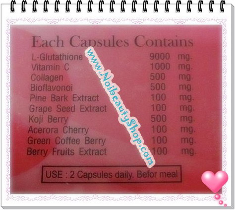 ส่วนประกอบ : L-Glutathion,Vitamin C, Collagen, Bilflavonoi,