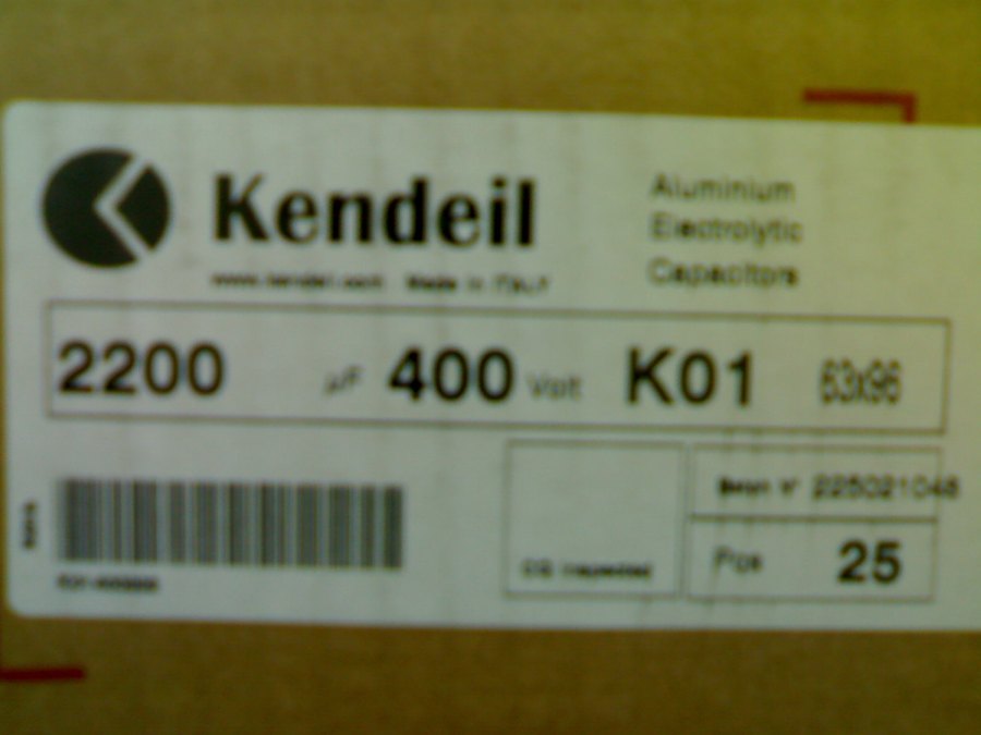 KENDEIL : K01 400222_0HM9H096 Alu.E-Cap. 2200 uF / 400 V dc ( 63 x 96 mm ) Packing Unit = 25 EA, Size 63 x 96 mm. screw terminal + Metal ring-Clamp Capacitance range : 2200 UF / 3300 UF / 4700 UF / 5600 UF / 6800 UF / 10000 UF rate voltages : 350 Vdc / 400 V dc / 450 V dc / 500 V dc K01 - type Low ESR ,Useful life > 12,000 h at 85 C degree. Made in Italy