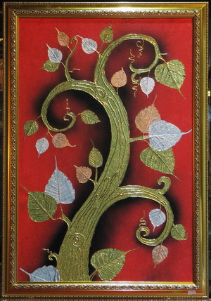 ภาพลายทอง รูปต้นโพธิ์ ประดับด้วยแผ่นทอง เงิน นาค บนใบโพธิ์แท้ ขนาดใหญ่ พร้อมกรอบ ขนาด 58 x 85 cm.