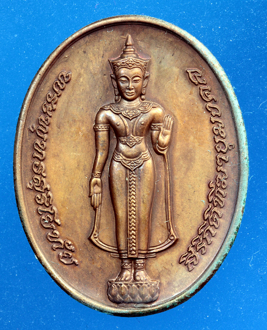 เหรียญรูปเหมือนพิมพ์ยืนเต็มองค์พระพุทธสุริโยทัย ปีพ.ศ. 2534 เนื้อทองแดง เหรียญพระพุทธสุริโยทัยสิริ...
