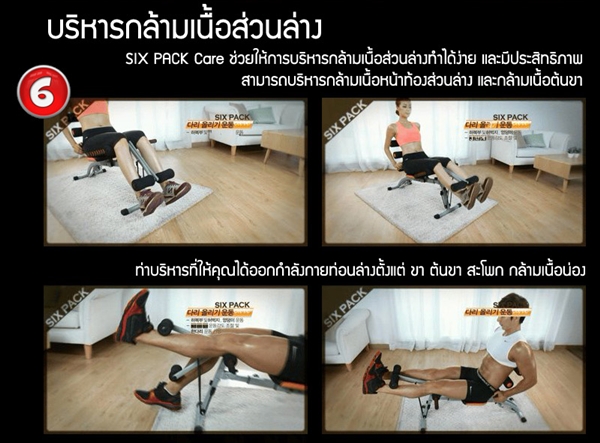 เครื่องบริหาร SIX PACK CARE (ซิก แพค แคร์) เครื่องบริหารลดหน้าท้อง ถูกออกแบบมาเพื่อการบริหารหน้าท้องแบบ 2 ทิศทาง และซิทอัพได้กว่า 180 องศา ช่วยให้การบริหารทำได้อย่างมีประสิทธิภาพกว่าการบริหารบนพื้นถึง 2 เท่า มาพร้อมคุณสมบัติแบบ 6 in1 ในเครื่องเดียว ทั้งบริหารได้ขณะเอนตัวลง และบริหารได้ขณะยกตัวขึ้น ที่เน้นการบริหารกล้ามเนื้อหน้าท้อง , บริหารแบบทวิส ช่วยเน้นการบริหารกล้ามเนื้อข้างลำตัว, บริหารกล้ามเนื้อหน้าท้องส่วนล่างและกล้ามเนื้อต้นขา ,บริหารร่างกายส่วนบนด้วยท่าวิดพื้น, บริหารร่างกายส่วนล่าง ขา และน่อง