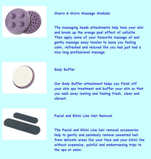 หัวกำจัดขน ใช้กำจัดขนตามร่างกายบริเวณ แขน,ขา,ขอบชุดชั้นใน,ขนใบหน้า,ขนใต้สะดือหรือขนหน้าอกผู้ชาย หัวนวดใช้นวดเพื่อความผ่อนคลาย หรือนวดตรงที่จุดบริเวณที่ปวดเมื่อย ใช้นวดเพื่อทำให้ไขมันแตกตัว เพื่อการกระชับกล้ามเนื้อในส่วนที่ต้องการลดสัดส่วน หัวแปลงนุ่ม สามารถใช้ในการทำความสะอาดผิวหน้าไม่ให้สิวอุดตัน และสิวเสี้ยน ที่เกิดจากการล้างหน้าไม่สะอาด หัวขัดเท้า สามารถใช้ขัดเท้าให้เรียบเนียน ไม่แห้งกร้าน หัวฟองน้ำใช้เพื่อช่วยการผลักครีมซึมเข้าสู่ผิว
