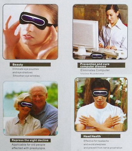 - เครื่องนวดตาไฟฟ้า ใช้นวดกระตุ้นการไหลเวียนโลหิตคลายความเมื่อยล้าของดวงตา และเพื่อผ่อนคลาย ช่วยให้นอนหลับสบาย