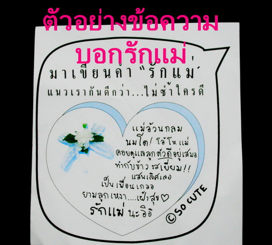 หมอนหัวใจสีฟ้าอ่อนคาดริบบิ้นลูกไม้สวยๆพร้อมดอกมะลิ บอกรักแม่ได้ทุกวัน หมอนทำมาเป็นพิเศษ ด้านหน้าหมอนมีสกรีนบทกลอนว่า "พระคุณแม่นั้นยิ่งใหญ่ตลอดมา เหมือนนางฟ้ามาโปรดลูกคนนี้ เป็นทั้งพี่ ทั้งน้อง และเพื่อนที่แสนดี ลูกคนนี้จะเป็นเด็กดีเพื่อแม่เอย" ด้านล่างปักดิ้นสีเงินว่า " รักแม่มากนะ "