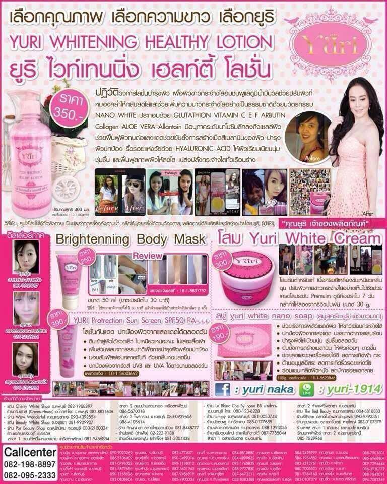 Yuri White Cream สารสกัดจากโสมมีประสิทธิภาพสูงในการปรับสภาพผิวพรรณขาวสว่างใสเรียบเนียน ผสมขมิ้น ซึ่งให้ความขาวที่ดีและรวดเร็ว ไม่มีอันตราย พร้อมทั้งยังอุดมไปด้วยสารสกัดจากพีช และอุดมไปด้วย Niacinemide ที่มีส่วนช่วยให้ผิวพรรณ กระจ่างใส และสว่างยิ่งขึ้นพร้อมช่วยลดสารอนุมูลอิสระ ปกป้องผิวจากรังสี UV และซ่อมแซมผิวจากอันตรายจากแสงแดด ป้องกันการเสื่อมของเซลล์ผิว ปรับสภาพผิวให้ขาวเนียนใส และกระชับตึงช่วยยับยั้งการสร้างเม็ดสีผิวหรือเมลานิน จึงทำให้ผิวดูกระจ่างใสขึ้นกว่าเดิม และมีคุณสมบัติในการช่วยรักษาฝ้ากระชับรูขุมขน พร้อมผลัดเซลล์ผิวอย่างอ่อนโยน สามารถใช้กับผิวที่บอบบางได้ พร้อมทั้งยังสามารถฆ่าเชื้อแบคทีเรีย และลดอาการอักเสบของผิวได้อย่างดี