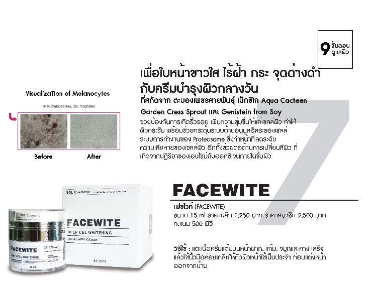 Facewite ครีมบำรุง ที่ช่วยต่อต้านการเกิดอนุมูลอิสระในไขมันและต่อต้านการเปลี่ยนสีผิวที่เกิดจากปฏิกิริยาของเอนไซน์กับออกซิเจนภายในชั้นผิว ด้วยส่วนผสมของ Arbutin ช่วยเสริมสร้างประสิทธิภาพในการดูแลรักษา กำจัดปัจจัยที่เป็นสาเหตุให้ผิวหมองคล้ำ จุดด่างดำ เพิ่มความชุ่มชื้นแก่ผิวด้วยสารสกัดจาก Opuntia Streptacantha คือต้นกระบองเพชรสายพันธ์ประจำถิ่นของเม็กซิโก ที่อุดมไปด้วยไฟเบอร์ที่สำคัญ วิตามินและแร่ธาตุที่มีประโยชน์ อีกทั้งส่วนผสมของ Aqua Cacteen ซึ่งให้ความชุ่มชื้นที่ดี ทำให้ผิวกระชับ นุ่มนวลไม่ระคายเคืองในชั้นผิวเมื่อได้รับการกระตุ้นจากระบบประสาทที่ตึงเครียด