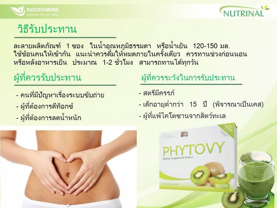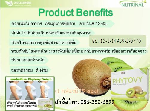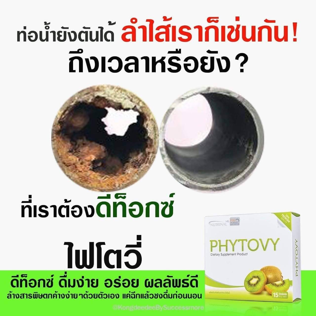 ไฟโตวี่ (PHYTOVY) 1 ซองก่อนนอนเพื่อช่วยให้ระบบขับถ่ายปรับสมดุลแบบธรรมชาติ เซาะสิ่งตกค้างในลำไส้ที่มีอยู่อย่างยาวนานให้หลุดออกมา ช่วยให้ลำไส้สะอาด ปราศจากสารพิษตกค้าง และช่วยให้หลอดเหลือดสะอาด ผิวพรรณสดใส ไฟโตวี่ ไม่ใช่ยาระบาย แต่เป็นผลิตภัณฑ์เสริมอาหารที่มีส่วนช่วยทำให้ระบบขับถ่ายเป็นไปอย่างราบรื่น ลดอาการท้องผูก คนขับถ่ายยากกินได้ คนท้องผูกมากๆ กินดี คนท้องไม่ผูกเลยกินดีมาก คนอ้วนยิ่งกินดีเข้าไปใหญ่ เพราะไฟโตวี่ เซะไขมันที่สะสมตามต้นแขน ต้นขา หรือที่ๆ มีไขมันหลุดออกมาในลักษณะการขับถ่าย ฯ จุดเริ่มต้นของคนลงพุงคือ อุจจาระ นั้นเอง.