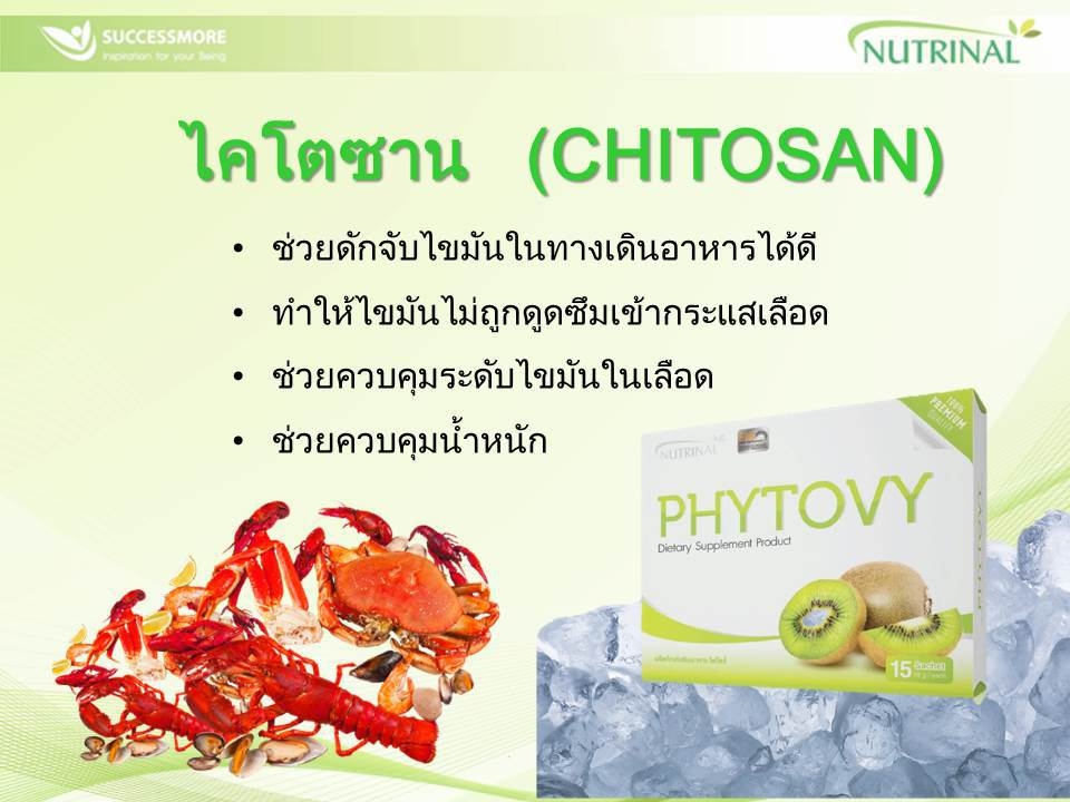 ไคโตซาน: ช่วยดักจับไขมันในทางเดินอาหารได้ดี ทำให้ไขมันไม่ถูกดูดซึมเข้ากระแสเลือด ช่วยควบคุมระดับไขมันในเลือด และช่วยควบคุมน้ำหนัก