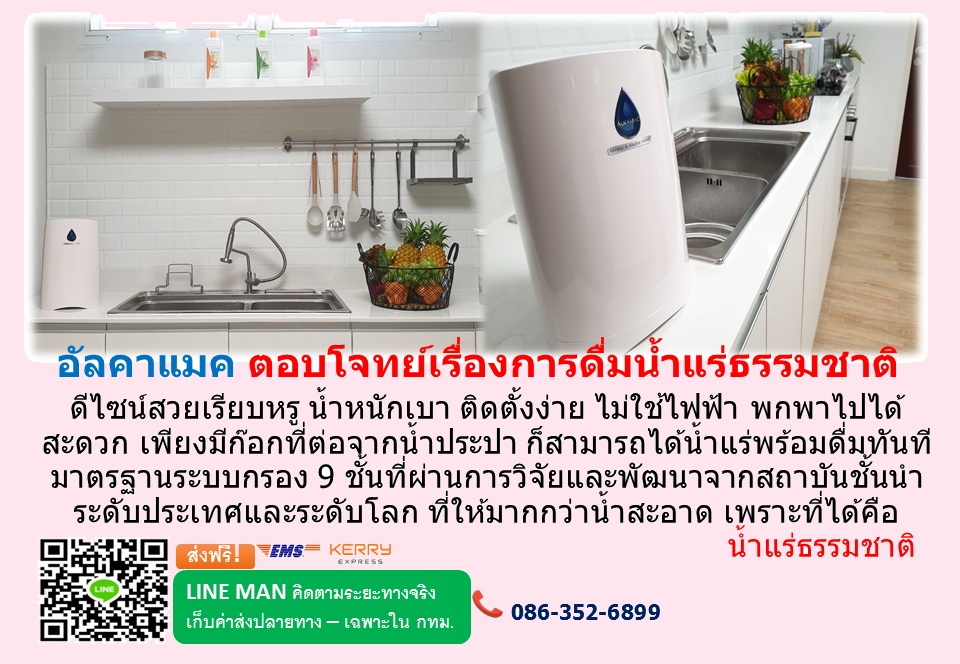 สนใจผลิตภัณฑ์เครื่องทำน้ำแร่อัลคาไลน์ ยี่ห้อ อัลคาแมท โทร. 086-352-6899 หรือ Id Line: jj_jeab2016