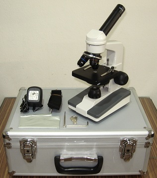 กล้องจุลทรรศน์ตาเดียวขนาดเล็ก กำลังขยาย 4 - 400 เท่า สามารถใช้ถ่านชาร์ตได้ พร้อมกล่องอลูมิเนียม ราคา 5,500 บาท (ไม่รวมค่าจัดส่งสินค้า)