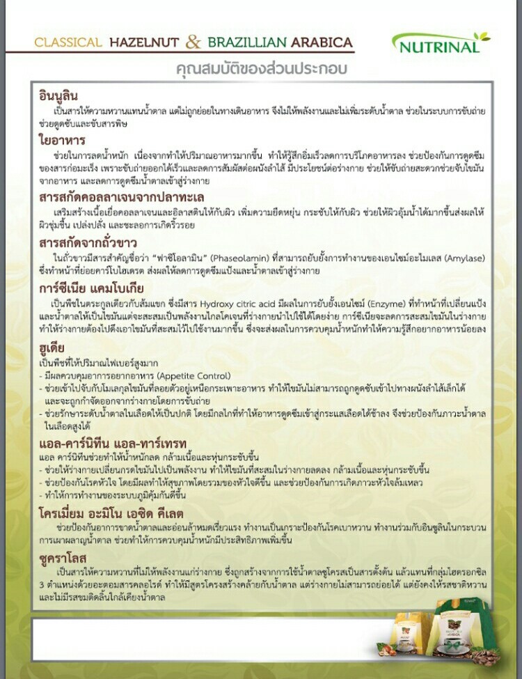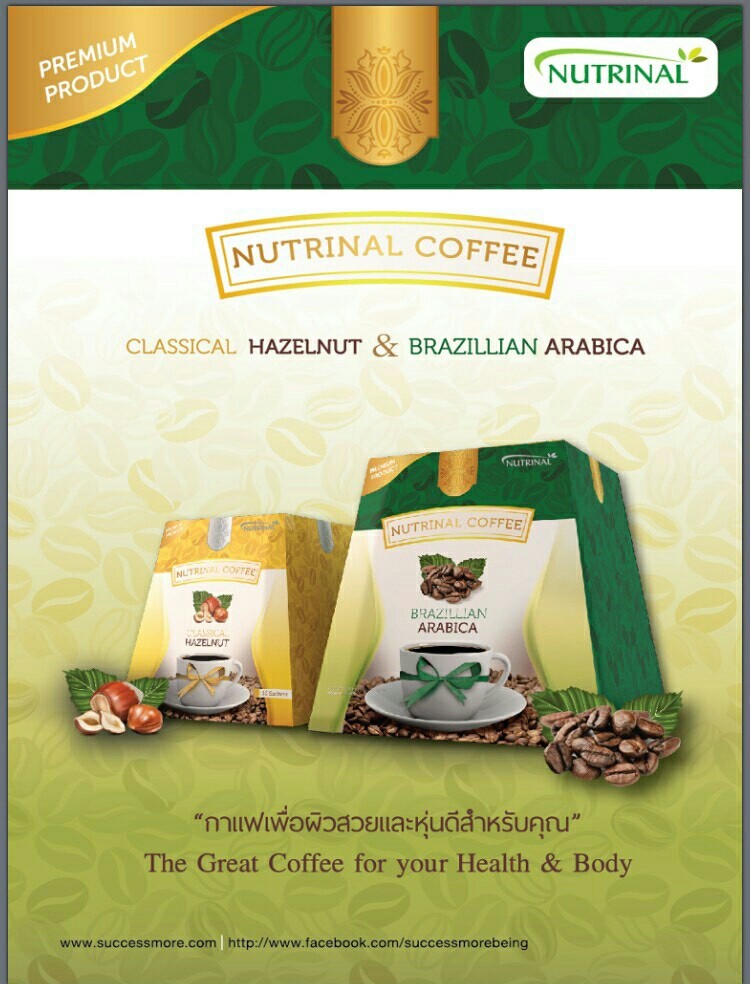 Nutrinal Brazillian Coffee (กาแฟเพื่อสุขภาพ บาซิลเลี่ยน อราบิก้า (Brazillian Arabica) มีส่วนผสมของคอลลาเจนจากปลาทะเลน้ำลึกและใยอาหาร รสเข้ม หอมแบบกาแฟอาราบิก้า รสชาติกลมกล่อมแบบไม่ใส่น้ำตาล ใส่โครเมี่ยมเพื่อช่วยปรับระดับน้ำตาลในเลือด เหมาะสำหรับผู้ที่ต้องการควบคุมน้ำหนัก และผู้ที่หลีกเลี่ยงความหวานจากน้ำตาล + ผิวสวย