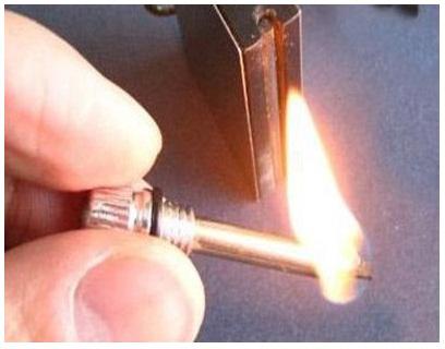 2. ใช้ปลายก้านไม้ขีดขีดบริเวณด้านชนวน (ด้านข้าง ดังรูป) ถ้าไส้มีน้ำมันไฟก็จะติด ถ้าไส้ไม่มีน้ำมันก็จะเกิดประกายไฟ