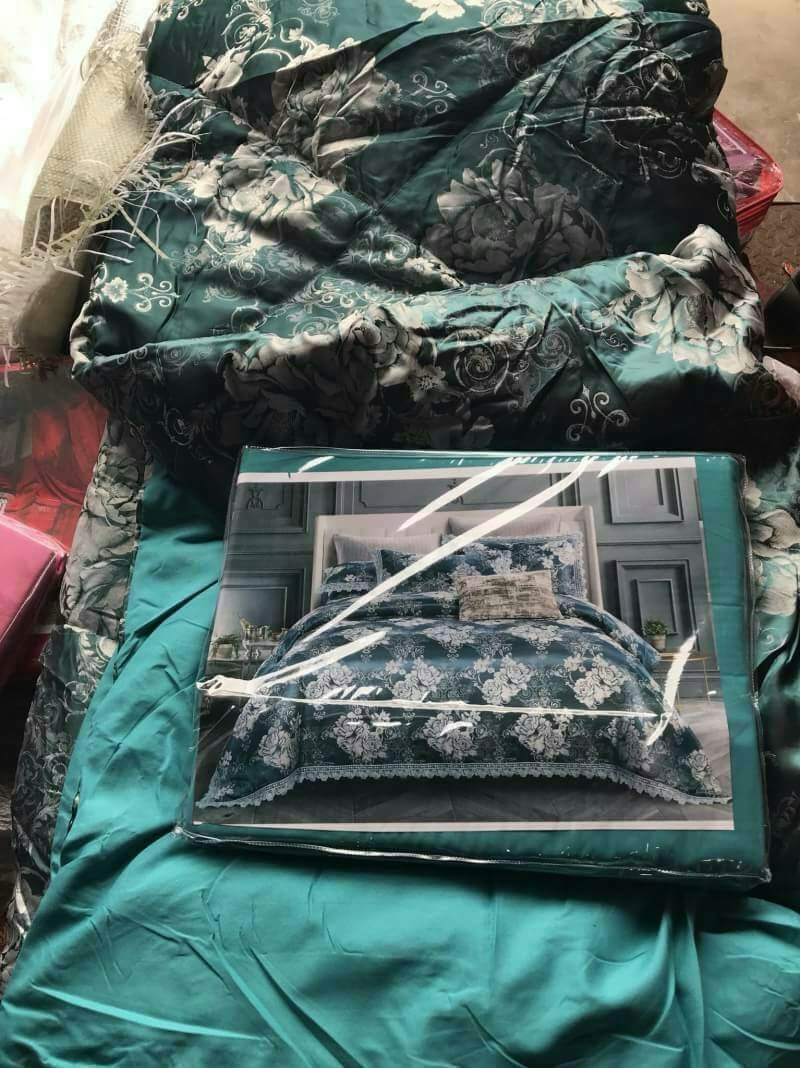 ชุดผ้าปูที่นอน ผ้าแพร ขนาด 6 ฟุต พร้อมผ้านวม สีเขียว