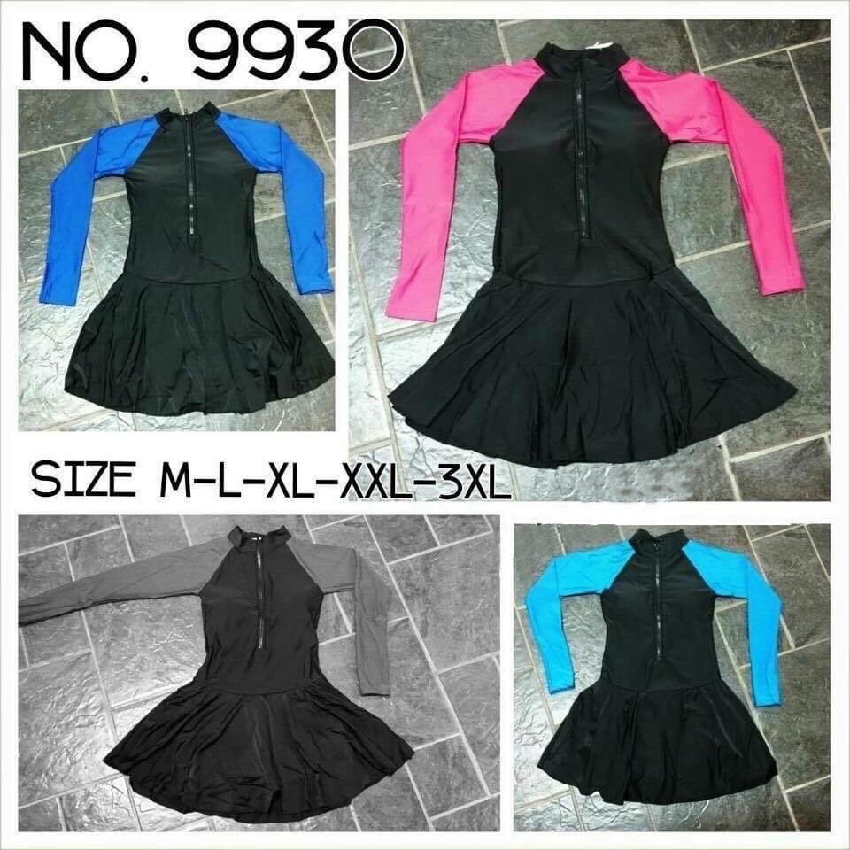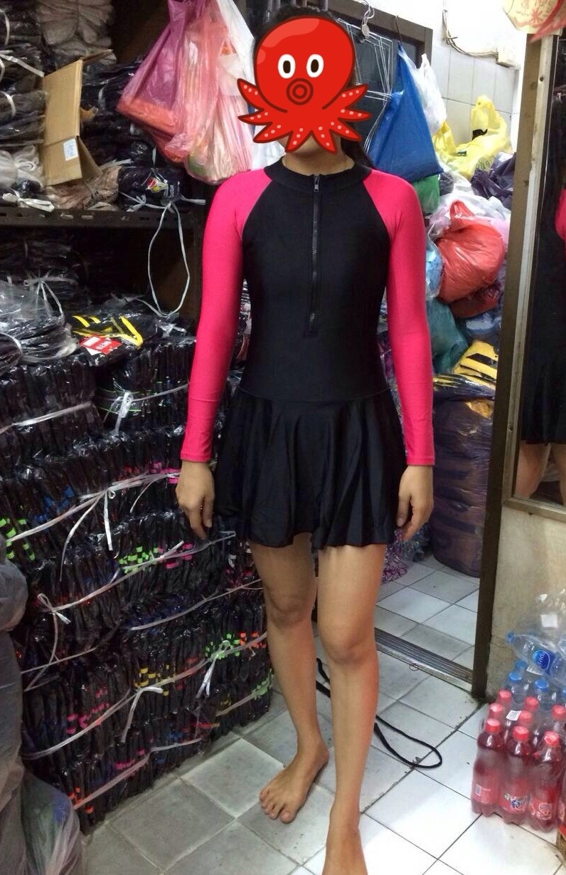 ชุดว่ายน้ำเต็มตัวแบบกระโปรง เสื้อแขนยาว ผ้า lycra/spndex อย่างดี ตัวชุดเป็นสีดำ ตัดต่อแขนยาว(ทูโทน) มีซิปด้านหน้า ด้านล่างข้างในเป็นกางเกงขาสั้น ข้างนอกเป็นกระโปรง เนื้อผ้า lycra อย่างดี แนบกระชับตามรูปร่าง