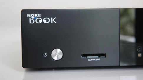 ส่วนด้านหน้าตัวเครื่องฝั่งทางซีกซ้ายจะเป็นพลาสติกสีดำด้าน ซึ่งด้านบนจะมีสกรีนคำว่า Nore Book ถัดลงมาด้านล่างจะเป็นปุ่ม Power และก็มีช่องสำหรับใส่การ์ด SD / MMS / MS มาให้อีกด้วย